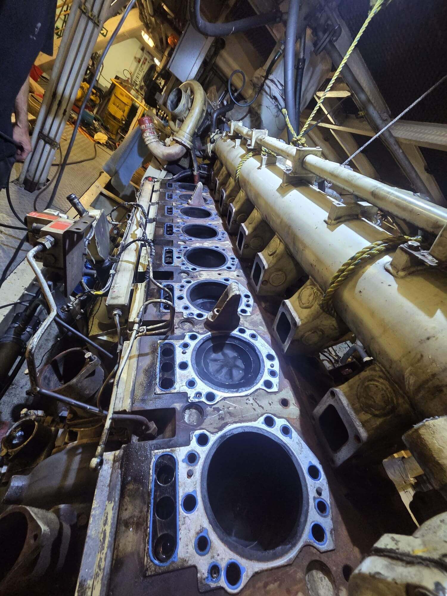 Su questo rimorchiatore, gli specialisti hanno affrontato la revisione della parte alta di due motori MAN da 9 cilindri in linea, modelli 27 e 38. Ogni fase di lavorazione ha richiesto la massima attenzione per rispettare gli standard internazionali di sicurezza e affidabilità.